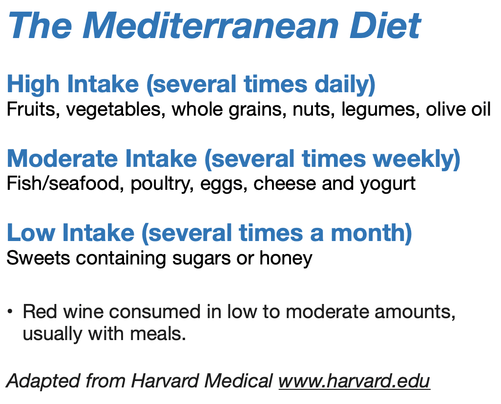 As summarized on the left, the Mediterranean Diet offers great flavor, diversity, and is viewed as protective, with plenty of veggies, nuts, greens, seeds, whole-grains, olive oil, eggs, diary, and healthy meats (poultry and fish), but restricts red and processed meats.