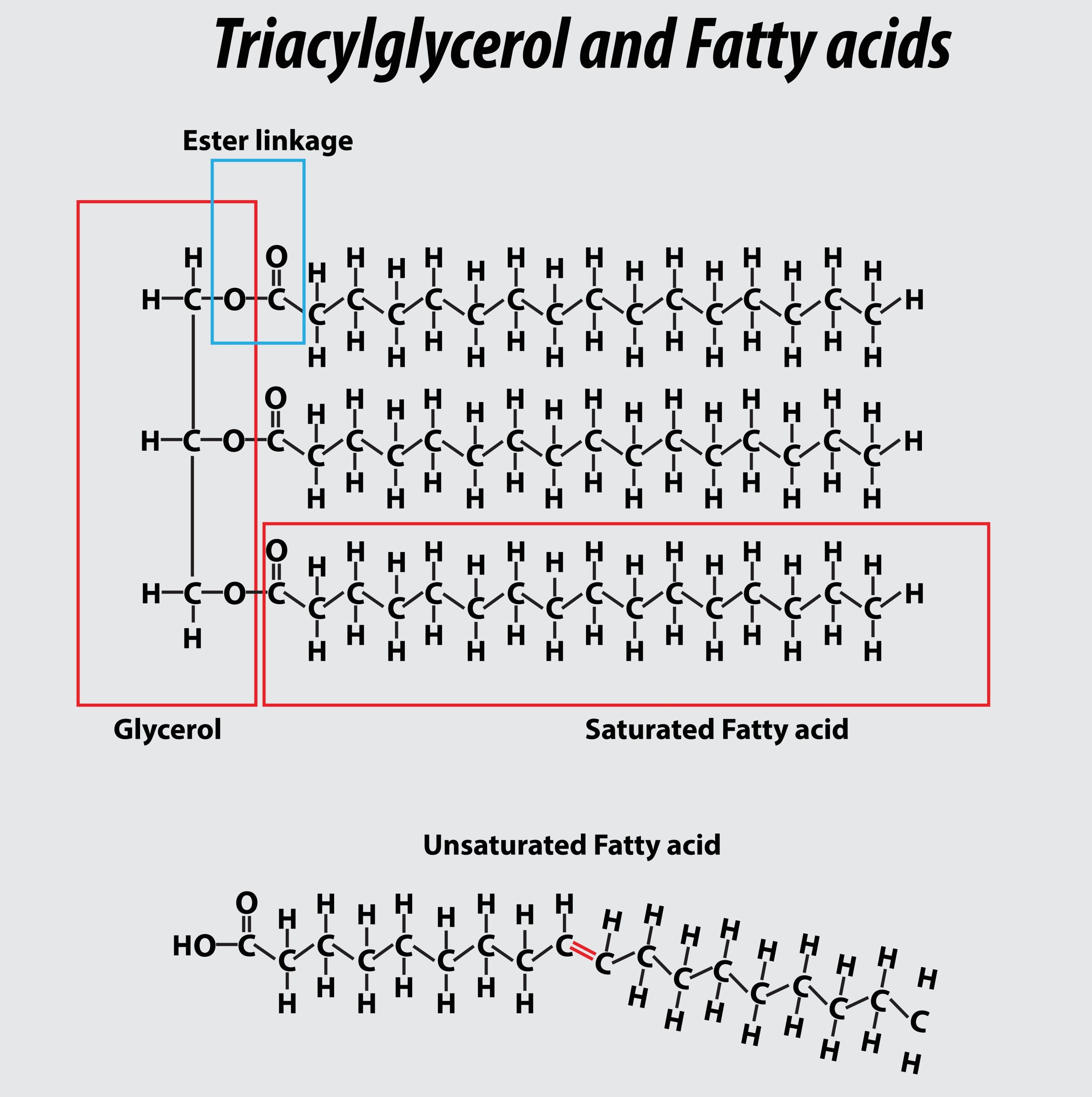 Fats are acidic, meaning they have a proton to share. The lower-right image shows a single fatty acid with one point of un-saturation (one double bond). This is a mono-unsaturated fatty acid, which is a major fraction of (healthier) olive oil.