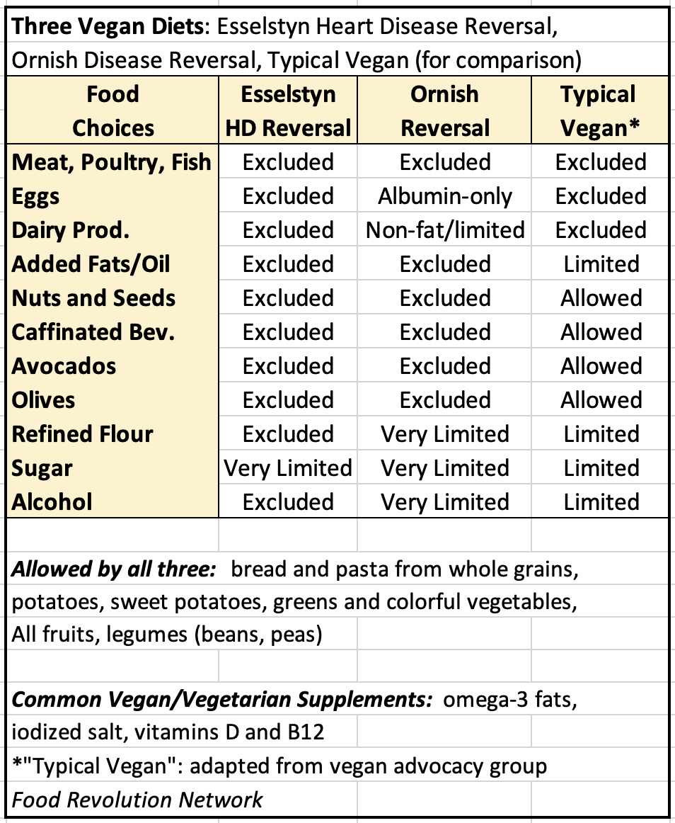 ABOVE RIGHT — The table is an approximation of two very low-fat diet programs developed by disease-reversal pioneers, doctors Caldwell Esselstyn, and Dean Ornish. For a comparison, a typical vegan diet-style, as advocated by Food Revolution Network is also shown.